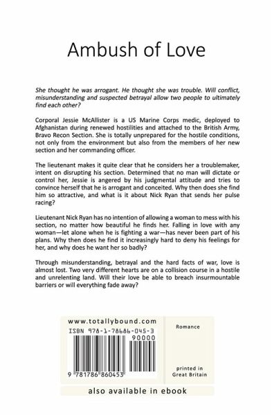 She thought he was arrogant. He thought she was trouble. Will conflict, misunderstanding and suspected betrayal allow two people to ultimately find each other? Corporal Jessie McAllister is a US Marine Corps medic, deployed to Afghanistan during renewed hostilities and attached to the British Army, Bravo Recon Section. She is totally unprepared for the hostile conditions, not only from the environment but also from the members of her new section and her commanding officer. The lieutenant makes it quite clear that he considers her a troublemaker, intent on disrupting his section. Determined that no man will dictate or control her, Jessie is angered by his judgmental attitude and tries to convince herself that he is arrogant and conceited. Why then does she find him so attractive, and what is it about Nick Ryan that sends her pulse racing? Lieutenant Nick Ryan has no intention of allowing a woman to mess with his section, no matter how beautiful he finds her. Falling in love with any woman-let alone when he is fighting a war-has never been part of his plans. Why then does he find it increasingly hard to deny his feelings for her, and why does he want her so badly? Through misunderstanding, betrayal and the hard facts of war, love is almost lost. Two very different hearts are on a collision course in a hostile and unrelenting land. Will their love be able to breach insurmountable barriers or will everything fade away?