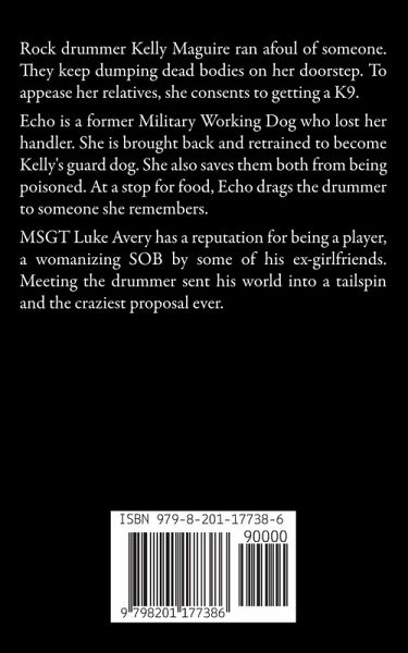 Rock drummer Kelly Maguire ran afoul of someone. They keep dumping dead bodies on her doorstep. To appease her relatives, she consents to getting a K9. Echo is a former Military Working Dog who lost her handler. She is brought back and retrained to become Kelly's guard dog. She also saves them both from being poisoned. At a stop for food, Echo drags the drummer to someone she remembers. MSGT Luke Avery has a reputation for being a player, a womanizing SOB by some of his ex-girlfriends. Meeting the drummer sent his world into a tailspin and the craziest proposal ever.