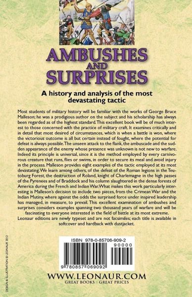 A history and analysis of the most devastating tactic Most students of military history will be familiar with the works of George Bruce Malleson; he was a prodigious author on the subject and his scholarship has always been regarded as of the highest standard. This excellent book will be of much interest to those concerned with the practice of military craft. It examines critically and in detail that most desired of circumstances, which is when a battle is won, where the victorious outcome is all but certain instead of fought, where the potential for defeat is always possible. The unseen attack to the flank, the ambuscade and the sudden appearance of the enemy whose presence was unknown is not new to warfare. Indeed its principle is universal, since it is the method employed by every carnivorous creature that runs, flies or swims, in order to secure its meal and avoid injury in the process. Malleson provides eight examples of the tactic employed at its most devastating. We learn among others, of the defeat of the Roman legions in the Teutoburg Forest, the destruction of Roland, knight of Charlemagne in the high passes of the Pyrenees and of Braddock and his column slaughtered in the dense forests of America during the French and Indian War. What makes this work particularly interesting is Malleson's decision to include two pieces, from the Crimean War and the Indian Mutiny, where against the odds the surprised force under inspired leadership has managed, in measure, to prevail. This excellent examination of ambushes and surprises considers examples spanning two thousand years of warfare and will be fascinating to everyone interested in the field of battle at its most extreme.>br> Leonaur editions are newly typeset and are not facsimiles; each title is available in softcover and hardback with dustjacket.