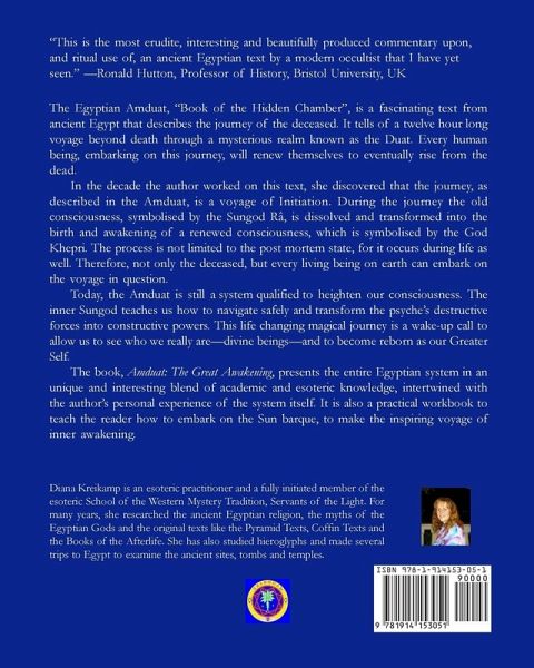 The Egyptian Amduat, "Book of the Hidden Chamber", is a fascinating text from ancient Egypt that describes the journey of the deceased. It tells of a twelve hour long voyage beyond death through a mysterious realm known as the Duat. Most people are curious about what happens after we make our departure into the Afterlife. The most pressing question usually entails the finality of it all. Is death truly the end of life, the end of our being? Or is death merely the transition to a new place where we can continue our life in a different form? Unfortunately, no person living on earth is able to provide an answer to shine a light on this mystery. The Egyptian Amduat, "Book of the Hidden Chamber", however, provides a solution to this riddle as it promises that every human being, embarking on this journey, will renew himself to eventually rise from the dead. It clearly describes the entire journey after death through texts and illustrations. According to the Amduat, it was a journey which lasted twelve hours starting at dusk and ending at dawn. In the decade the author worked on this text, she discovered that the journey, as described in the Amduat, is a voyage of Initiation. During the journey the old consciousness, symbolised by the Sungod Râ, is dissolved and transformed into the birth and awakening of a renewed consciousness, which is symbolised by the God Khepri. The process is not limited to the post mortem state, for it occurs during life as well. Therefore, not only the deceased, but every living being on earth can embark on the voyage in question. The group of elite priests in ancient Egypt knew this fact well and used the Amduat to become initiates themselves. Today, the Amduat is still a system qualified to heighten our consciousness. The texts with the corresponding images serve as a guide to show the way to our goal. The inner Sungod teaches us how to navigate safely and transform the psyche's destructive forces into constructive powers. This life changing magical journey provides us with the opportunity to look ourselves in the eye, honestly and sincerely. It is a wake-up call to allow us to see who we really are- divine beings- and to become reborn as our Greater Self. This grants us the power to reconnect with our true potential and to manifest all our gifts and talents in life itself. The book, The Great Awakening; the Way of the Amduat, presents the entire Egyptian system in an unique and interesting blend of academic and esoteric knowledge, intertwined with the author's personal experience of the system itself. The text of the Amduat is explained in clear and comprehensible wording translated to suit our modern age. It is also a practical workbook to teach the reader how to embark on the Sun barque, together with his or her inner Sungod, to make the inspiring voyage of inner awakening. The subsequent gradual transformation and the manner in which it takes shape in daily life, is explained hour by hour from an academic, esoteric and practical perspective.