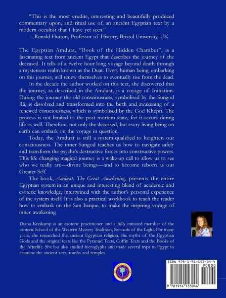 The Egyptian Amduat, "Book of the Hidden Chamber", is a fascinating text from ancient Egypt that describes the journey of the deceased. It tells of a twelve hour long voyage beyond death through a mysterious realm known as the Duat. Most people are curious about what happens after we make our departure into the Afterlife. The most pressing question usually entails the finality of it all. Is death truly the end of life, the end of our being? Or is death merely the transition to a new place where we can continue our life in a different form? Unfortunately, no person living on earth is able to provide an answer to shine a light on this mystery. The Egyptian Amduat, "Book of the Hidden Chamber", however, provides a solution to this riddle as it promises that every human being, embarking on this journey, will renew himself to eventually rise from the dead. It clearly describes the entire journey after death through texts and illustrations. According to the Amduat, it was a journey which lasted twelve hours starting at dusk and ending at dawn. In the decade the author worked on this text, she discovered that the journey, as described in the Amduat, is a voyage of Initiation. During the journey the old consciousness, symbolised by the Sungod Râ, is dissolved and transformed into the birth and awakening of a renewed consciousness, which is symbolised by the God Khepri. The process is not limited to the post mortem state, for it occurs during life as well. Therefore, not only the deceased, but every living being on earth can embark on the voyage in question. The group of elite priests in ancient Egypt knew this fact well and used the Amduat to become initiates themselves. Today, the Amduat is still a system qualified to heighten our consciousness. The texts with the corresponding images serve as a guide to show the way to our goal. The inner Sungod teaches us how to navigate safely and transform the psyche's destructive forces into constructive powers. This life changing magical journey provides us with the opportunity to look ourselves in the eye, honestly and sincerely. It is a wake-up call to allow us to see who we really are- divine beings- and to become reborn as our Greater Self. This grants us the power to reconnect with our true potential and to manifest all our gifts and talents in life itself. The book, The Great Awakening; the Way of the Amduat, presents the entire Egyptian system in an unique and interesting blend of academic and esoteric knowledge, intertwined with the author's personal experience of the system itself. The text of the Amduat is explained in clear and comprehensible wording translated to suit our modern age. It is also a practical workbook to teach the reader how to embark on the Sun barque, together with his or her inner Sungod, to make the inspiring voyage of inner awakening. The subsequent gradual transformation and the manner in which it takes shape in daily life, is explained hour by hour from an academic, esoteric and practical perspective.