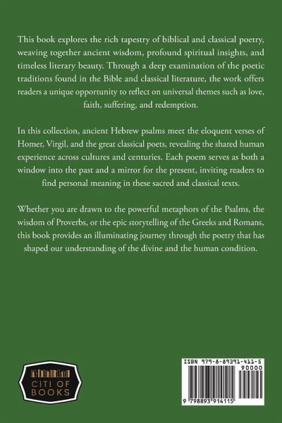 This book explores the rich tapestry of biblical and classical poetry, weaving together ancient wisdom, profound spiritual insights, and timeless literary beauty. Through a deep examination of the poetic traditions found in the Bible and classical literature, the work offers readers a unique opportunity to reflect on universal themes such as love, faith, suffering, and redemption. In this collection, ancient Hebrew psalms meet the eloquent verses of Homer, Virgil, and the great classical poets, revealing the shared human experience across cultures and centuries. Each poem serves as both a window into the past and a mirror for the present, inviting readers to find personal meaning in these sacred and classical texts. Whether you are drawn to the powerful metaphors of the Psalms, the wisdom of Proverbs, or the epic storytelling of the Greeks and Romans, this book provides an illuminating journey through the poetry that has shaped our understanding of the divine and the human condition.