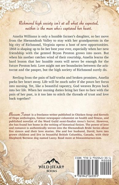 Richmond high society isn't at all what she expected, neither is the man who's captured her heart. Amelia Williams is only a humble farmer's daughter, so her move from the Shenandoah Valley to stay with her grandparents in the big city of Richmond, Virginia opens a host of new opportunities. 1868 is shaping up to be her best year ever, especially when her new friendship with the genteel Bryon Preston grows into more. But when his mother catches wind of their courtship, Amelia learns the hard lesson that her humble roots will never be enough for the future Preston heir. Love might not see boundaries between the aristocrat and the pauper, but the high society of Richmond surely do. Reeling from the pain of half-truths and broken promises, Amelia packs her heart away. Life will be much safer if she pours her focus into nursing. Yet, like a beautiful tapestry, God weaves Bryon back into her life. When her nursing duties bring her face to face with the pain of her past, is it too late to stitch the threads of trust and love back together?