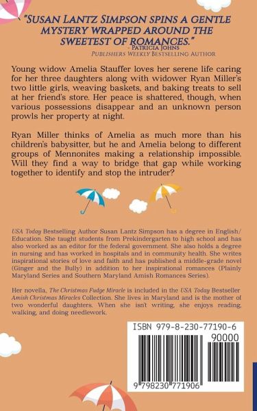 Young widow Amelia Stauffer loves her serene life caring for her three daughters along with widower Ryan Miller's two little girls, weaving baskets, and baking treats to sell at her friend's store. Her peace is shattered, though, when various possessions disappear and an unknown person prowls her property at night. Ryan Miller thinks of Amelia as much more than his children's babysitter, but he and Amelia belong to different groups of Mennonites making a relationship impossible. Will they find a way to bridge that gap while working together to identify and stop the intruder?