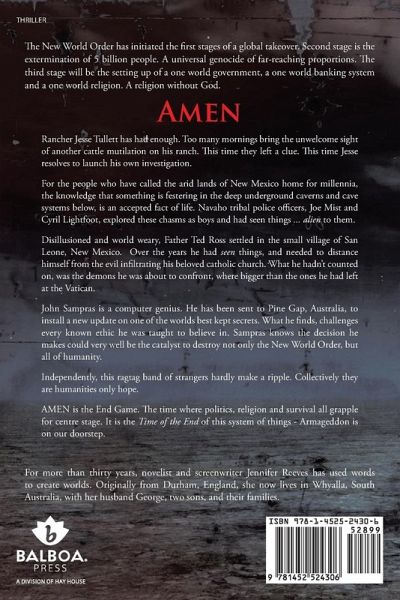 Rancher Jesse Tullett has had enough. Too many mornings bring the unwelcome sight of another cattle mutilation on his ranch. This time they left a clue. This time Jesse resolves to launch his own investigation. For the people who have called the arid lands of New Mexico home for millennia, the knowledge that something is festering in the deep underground caverns and cave systems below, is an accepted fact of life. Navaho tribal police officers, Joe Mist and Cyril Lightfoot, explored these chasms as boys and had seen things ... alien to them. Disillusioned and world weary, Father Ted Ross settled in the small village of San Leone, New Mexico. Over the years he had seen things, and needed to distance himself from the evil infiltrating his beloved catholic church. What he hadn?t counted on, was the demons he was about to confront, where bigger than the ones he had left at the Vatican. John Sampras is a computer genius. He has been sent to Pine Gap, Australia, to install a new update on one of the worlds best kept secrets. What he finds, challenges every known ethic he was taught to believe in. Sampras knows the decision he makes could very well be the catalyst to destroy not only the New World Order, but all of humanity. Independently, this ragtag band of strangers hardly make a ripple. Collectively they are humanities only hope. AMEN is the End Game. The time where politics, religion and survival all grapple for centre stage. It is the Time of the End of this system of things - Armageddon is on our doorstep.
