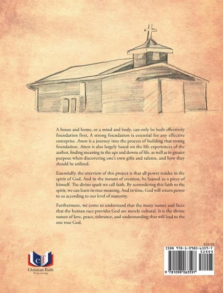 A house and home, or a mind and body, can only be built effectively foundation first. A strong foundation is essential for any effective enterprise. Amen is a journey into the process of building that strong foundation. Amen is also largely based on the life experiences of the author, finding meaning in the ups and downs of life, as well as in greater purpose when discovering one's own gifts and talents, and how they should be utilized. Essentially, the overview of this project is that all power resides in the spirit of God. And in the instant of creation, he loaned us a piece of himself. The divine spark we call faith. By surrendering this faith to the spirit, we can learn its true meaning. And in time, God will return power to us according to our level of maturity. Furthermore, we come to understand that the many names and faces that the human race provides God are merely cultural. It is the divine nature of love, peace, tolerance, and understanding that will lead to the one true God.