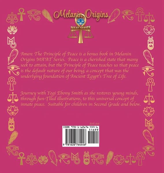 Amen: The Principle of Peace is a bonus book in Melanin Origins MA'AT Series. Peace is a cherished state that many seek to attain, but the Principle of Peace teaches us that peace is the default nature of our being; a concept that was the underlying foundation of Ancient Egypt's Tree of Life. Journey with Yogi Ebony Smith as she restores young minds, through fun-filled illustrations, to this universal concept of innate peace. Suitable for children in Second Grade and below.