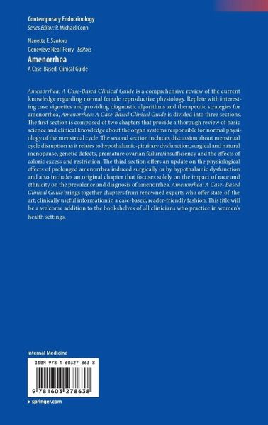 "In Amenorrhea, A Case-Based, Clinical Guide, the editors state that they set out to organize a comprehensive review of amenorrhea that would update clinicians 'on our current knowledge regarding normal female reproductive physiology and ... discuss the pathophysiology, diagnostic algorithms, and therapeutic intervention for amenorrhea.' The book begins well, with two chapters on what is normal, followed by chapters addressing the various causes of amenorrhea. ... The last several chapterswere especially informative." (R. Wayne Inzer, Baylor University Medical Center Proceedings, July, 2011)