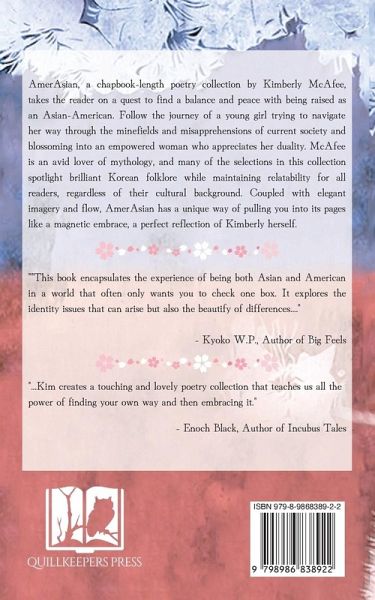 AmerAsian, a chapbook-length poetry collection by Kimberly McAfee, takes the reader on a quest to find a balance and peace with being raised as an Asian-American. Follow the journey of a young girl trying to navigate her way through the minefields and misapprehensions of current society and blossoming into an empowered woman who appreciates her duality. McAfee is an avid lover of mythology, and many of the selections in this collection spotlight brilliant Korean folklore while maintaining relatability for all readers, regardless of their cultural background. Coupled with elegant imagery and flow, AmerAsian has a unique way of pulling you into its pages like a magnetic embrace, a perfect reflection of Kimberly herself.