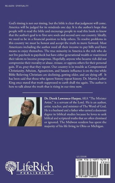 God's timing is not our timing, but the bible is clear that judgment will come. America will be judged for its misdeeds one day. It is the author's hope that people will re-read the bible and encourage people to read this book to know that the author's goal is to first save souls and second save our country. Ideally, we need to be in a financial position to help others. To resolve problems in this country we must be honest and accept the truth to move forward. Most Americans including the author need all their income to pay bills and have means to enjoy themselves. The true minority in America is the rich who do not live paycheck to paycheck but have either generational wealth or maximized their talents to become prosperous. Hopefully, anyone who became rich did not compromise their morality or abuse, misuse, or oppress others for their personal gain. If so, pray that they repent. Our country is in trouble as Compromised Christianity, Atheism, Agnosticism, and Satanic influence is on the rise while Bible Believing Christians are declining, getting older, and are dying off. It has been said that those who ignore history repeat history. Dr. Martin Luther King once stated that truth suppressed to earth shall rise again. The author is here to talk about the truth that is rising in our time now.