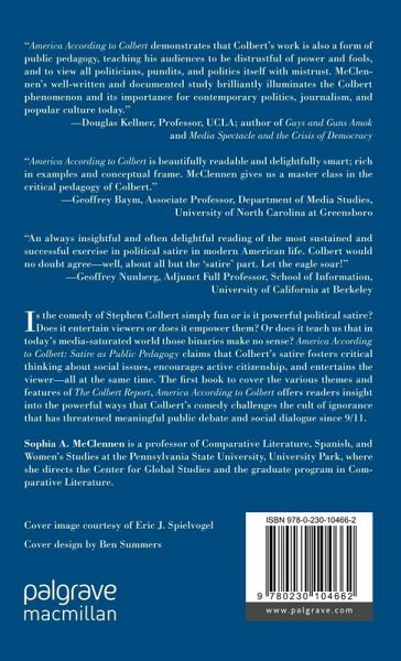 "America According to Colbert is beautifully readable and delightfully smart; rich in examples and conceptual frame. McClennen gives us a master class in the critical pedagogy of Colbert." - Geoffrey Baym, Associate Professor, Department of Media Studies, University of North Carolina Greensboro