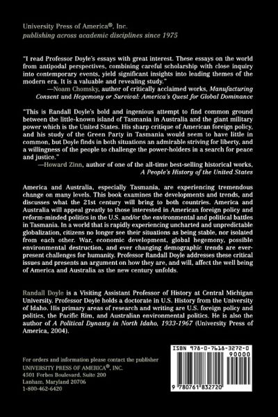 I read Professor Doyle's essays with great interest. These essays on the world from antipodal perspectives, combining careful scholarship with close inquiry into contemporary events, yield significant insights into leading themes of the modern era. It is a valuable and revealing study. -- Noam Chomsky, author of critically acclaimed works, Manufacturing Consent and Hegemony or Survival: America's Quest for Global Dominance This is Randall Doyle's bold and ingenious attempt to find common ground between the little-known island of Tasmania in Australia and the giant military power which is the United States. His sharp critique of American foreign policy, and his study of the Green Party in Tasmania would seem to have little in common, but Doyle finds in both situations an admirable striving for liberty, and a willingness of the people to challenge the power-holders in a search for peace and justice. -- Howard Zinn, Author of A People's History of the United States and Professor Emeritus of Political Science, Boston University