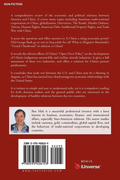 A comprehensive review of the economic and political relations between America and China. It covers such topics as American multi-national corporations in China, globalization, American Dollar, Derivatives, The Bomb, Missiles Defense, the problem of Taiwan, MFN, China Threat, Petrodollar, Human Rights, American Debt, WTO Intellectual Rights, and Trade War with China. It poses the question and answers of: Is China the rising economic power? Did George Bush go to war in Iraq solely because of oil? What is Zbigniew Brzezinski's "Grand Chessboard" in relation to China? It reveals the adverse effect of China's "Open-Door Policy" on the development of Chinese indigenous automobile, civilian aircraft industry, gives a full assessment of these two industries, and offers a solution for China's present predicament. It concludes that trade war between U.S. and China may be a blessing in disguise, as China entered into such a disadvantageous economic relationship with the United States. It is written in simple and easy to understand manner, yet compulsory reading for both the decision makers and general public with are interested in the development of a healthy relations between the two countries.