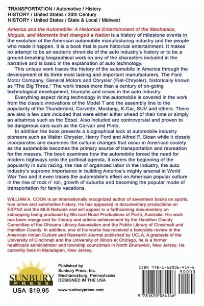 America and the Automobile: A Historical Entertainment of the Mechanics, Moguls, and Moments that Changed a Nation is a history of milestone events in the evolution of the American automobile manufacturing industry and the people that made it happen. It is a book that is pure historical entertainment. It makes no attempt to be an esoteric chronicle of the auto industry's history or to be a ground-breaking biographical work on any of the characters included in the narrative and is basic in the explanation of auto technology. This unique work traces the history of the automobile in America through the development of its three most lasting and important manufacturers, The Ford Motor Company, General Motors, and Chrysler (Fiat-Chrysler), historically known as "The Big Three." The work traces more than a century of on-going technological development, triumphs and crises in the auto industry. Everything aspect rising technology in the automobile is covered in the work from the classic innovations of the Model T and the assembly line to the popularity of the Thunderbird, Corvette, Mustang, K-Car, SUV and others. There are also a few cars included that were either ahead of their time or simply an albatross such as the Edsel. Also included are controversial and proven to be dangerous cars such as the Corvair and Pinto. In addition, the book presents a biographical look at automobile industry pioneers such as Walter Chrysler, Henry Ford, and Alfred P. Sloan while it closely incorporates and examines the cultural changes that occur in American society as the automobile becomes the primary source of transportation and recreation for the masses. The book examines how the automobile forced the need for modern highways onto the political agenda, it covers the beginning of the popularity in auto racing, the rise of organized labor in the industry, the auto industry's supreme importance in building America's mighty arsenal in World War Two and it even traces the automobile's effect on American popular culture in the rise of rock n' roll, growth of suburbs and becoming the popular mode of transportation for family vacations.