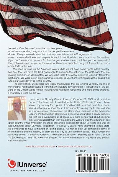 "America Can Recover" from the past few years of reckless spending programs that the people have not endorsed. Everyone needs to contact their representatives in the Congress and make it known what the American people want. It is not too late if we take actions. Remember if you don't voice your opinions for the changes you feel are correct then you become part of the problem instead of part of the solution. We can accomplish our goal if we set our minds and efforts to the task. We need to wake up the American voters while we still have some rights in this country. Not only that, we have the God given right to question the actions of the politicians that are making decisions in Washington. We would be fools if we allow ourselves to blindly follow the politicians. We were given brains and were meant to use them to think about the issued that affect our everyday lives in this country. The uninformed, uneducated and easily manipulated that are among us follow the line of thinking that has been presented to them by the leaders in Washington. It is past time for the citizens of the United States to start realizing what has been happening and make some changes. Fortunately, it is still not too late.