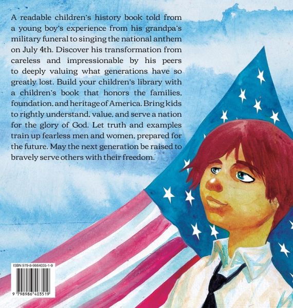 America Children's Book is a readable history book that honors the families, foundation, and heritage of America. Bring kids to rightly understand, value, and serve a nation for the glory of God. BOOK DESCRIPTION: (also book back cover) A readable children's history book told from a young boy's experience from his grandpa's military funeral and ends with the national anthem on July 4th. Discover his transformation from careless and impressionable by his peers to deeply valuing what generations have so greatly lost. Build your children's library with a children's book that honors the families, foundation, and heritage of America. Bring kids to rightly understand, value, and serve a nation for the glory of God. Let truth and examples train up fearless men and women, prepared for the future. May the next generation be raised to bravely serve others with their freedom. EBOOK: Free eBook with purchase of paperback or hardback in certain retailers. After purchase, come back to the eBook edition to download. DETAILS: 1. Pages: 44 2. Series number: 14 3. Series type: Children's Books on Life and Behavior 4. Series category: America 5. Series genre: Fiction 6. Children reading ages: Average age 8-12 years 7. Children reading grade level: Average 4th-6th grade 8. Children illustration ages: Average 2-12 years 9. Reading crowd: Children to adult 10. Reading length: Average 15-30 minutes (with dynamic expression and pauses) 11. Reading style: Illustrated narration. 12. Story tellers: Kids to Adults (parents, guardians, grandparents, teachers, pastors) 13. Historical setting: 17th-21st century 14. Purpose: Honor, respect, history, maturity, Christianity, Bible, bravery, freedom 15. Contextual Use: Family, home, school, church, neighborhoods, outreach, kid's club, plays, teaching 16. Story time suggestion: Nighttime, class time, vacation 17. Holiday/annual event: Memorial Day, Independence Day, July 4th, Veteran's Day