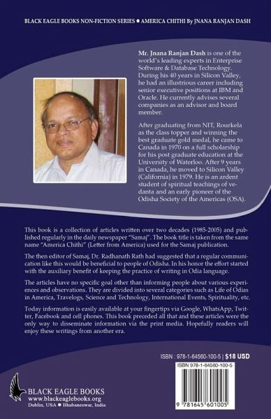 This book is a collection of articles written over two decades (1985-2005) and published regularly in the daily newspaper "Samaj". The book title is taken from the same name "America Chithi" (Letter from America) used for the Samaj publication. The then editor of Samaj, Dr. Radhanath Rath had suggested that a regular communication like this would be beneficial to people of Odisha. In his honor the effort started with the auxiliary benefit of keeping the practice of writing in Odia language. The articles have no specific goal other than informing people about various experiences and observations. They are divided into several categories such as Life of Odias in America, Travelogues, Science and Technology, International Events, Spirituality, etc. Today information is easily available at your fingertips via Google, WhatsApp, Twitter, Facebook and cell phones. This book preceded all that and these articles were the only way to disseminate information via the print media. Hopefully readers will enjoy these writings from another era.