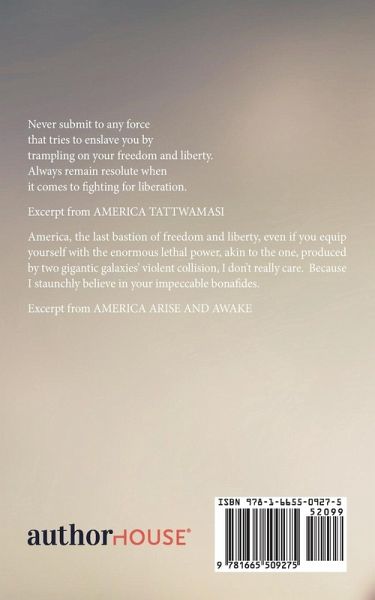 Never submit to any force that tries to enslave you by trampling on your freedom and liberty. Always remain resolute when it comes to fighting for liberation. Excerpt from AMERICA TATTWAMASI America, the last bastion of freedom and liberty, even if you equip yourself with the enormous lethal power, akin to the one, produced by two gigantic galaxies' violent collision, I don't really care. Because I staunchly believe in your impeccable bonafides. Excerpt from AMERICA ARISE AND AWAKE