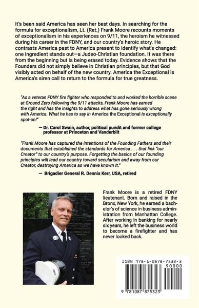 It's been said America has seen her best days. In searching for the formula for exceptionalism, Lt. (Ret.) Frank Moore recounts moments of exceptionalism in his experiences on 9/11, the heroism he witnessed during his career in the FDNY, and our country's heroic story. He contrasts America past to America present to identify what's changed: one ingredient stands out-a Judeo-Christian foundation. It was there from the beginning but is being erased today. Evidence shows that the Founders did not simply believe in Christian principles, but that God visibly acted on behalf of the new country. America the Exceptional is America's siren call to return to the formula for true greatness. "As a veteran FDNY fire fighter who responded to and worked the horrible scene at Ground Zero following the 9/11 attacks, Frank Moore has earned the right and has the insights to address what has gone seriously wrong with America. What he has to say in America the Exceptional is exceptionally spot-on!" - Dr. Carol Swain, author, political pundit and former college professor at Princeton and Vanderbilt "Frank Moore has captured the intentions of the Founding Fathers and their documents that established the standards for America . . . that link "our Creator" to our country's purpose. Forgetting the basics of our founding principles will lead our country toward secularism and away from our Creator, destroying America as we have known it." - Brigadier General R. Dennis Kerr, USA, retired "You have captured the key insights that made America great and presented them in a captivating way. America the Exceptional should be read across America. For our nation to preserve its freedoms, we must rediscover its founding secrets, and this book does exactly that." - William J. Federer, American historian and author Frank Moore is a retired FDNY lieutenant. Born and raised in the Bronx, New York, he earned a bachelor's of science in business administration from Manhattan College. After working in banking for nearly six years, he left the business world to become a firefighter and has never looked back.