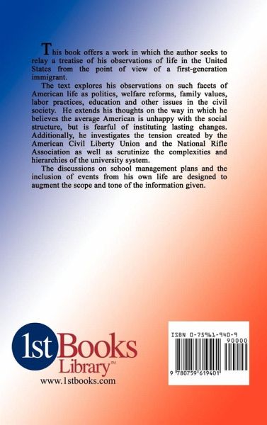 This book offers a work in which the author seeks to relay a treatise of his observations of life in the United States from the point of view of a first-generation immigrant. The text explores his observations on such facets of American life as politics, welfare reforms, family values, labor practices, education and other issues in the civil society.