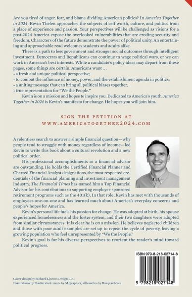 Are you tired of anger, fear, and blame dividing American politics? In America Together 2024, Kevin Thelen approaches the subjects of self-worth, culture, and politics from a place of experience and passion. Your perspectives will be challenged as visions for a post-2024 America expose the overlooked vulnerabilities that are eroding security and freedom. Characters of the future demonstrate the power of political unity. An entertaining and approachable read welcomes students and adults alike. There is a path to less government and stronger social outcomes through intelligent investment. Democrats and Republicans can continue to wage political wars, or we can work in America's best interests. While a candidate's policy ideas may depart from these pages, some things are certain. Americans want...a fresh and unique political perspective; to combat the influence of money, power, and the establishment agenda in politics; a uniting message that can bring all political biases together; true representation for "We the People." Kevin is on a mission and hopes to inspire you. Dedicated to America's youth, America Together in 2024 is Kevin's manifesto for change. He hopes you will join him. Sign the petition at www.AmericaTogether2024.com AUTHOR BIO A relentless search to answer a simple financial question - why people tend to struggle with money regardless of income - led Kevin to write this book about a cultural revolution and a new political order. His professional accomplishments as a financial advisor are outstanding. He holds the Certified Financial Planner and Charted Financial Analyst designations, the most respected credentials of the financial planning and investment management industry. The Financial Times has named him a Top Financial Advisor for his contributions to supporting employer-sponsored retirement programs such as the 401(k). In that role, Kevin has met with thousands of employees one-on-one and has learned much about America's everyday concerns and people's hopes for America. Kevin's personal life fuels his passion for change. He was adopted at birth, his spouse experienced homelessness and the foster system, and their two daughters were adopted from similar circumstances. It is clear he is on a mission. He believes neglected children and those with poor adult examples are set up to repeat the cycle of poverty, leaving a growing population who feel unrepresented by "We the People." Kevin's goal is for his diverse perspectives to reorient the reader's mind toward political progress.