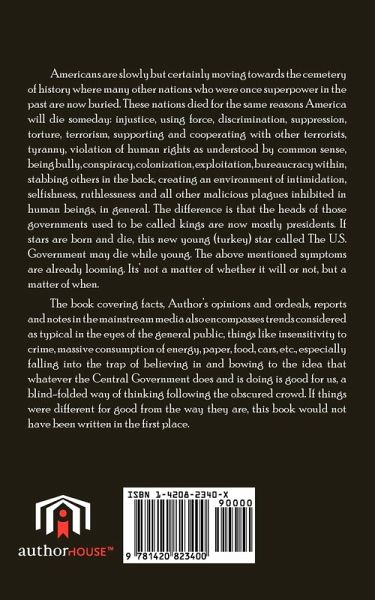 Americans are slowly but certainly moving towards the cemetery of history where many other nations who were once superpower in the past are now buried. These nations died for the same reasons America will die someday: injustice, using force, discrimination, suppression, torture, terrorism, supporting and cooperating with other terrorists, tyranny, violation of human rights as understood by common sense, being bully, conspiracy, colonization, exploitation, bureaucracy within, stabbing others in the back, creating an environment of intimidation, selfishness, ruthlessness and all other malicious plagues inhibited in human beings, in general. The difference is that the heads of those governments used to be called kings are now mostly presidents. If stars are born and die, this new young (turkey) star called The U.S. Government may die while young. The above mentioned symptoms are already looming. Its' not a matter of whether it will or not, but a matter of when. The book covering facts, Author's opinions and ordeals, reports and notes in the mainstream media also encompasses trends considered as typical in the eyes of the general public, things like insensitivity to crime, massive consumption of energy, paper, food, cars, etc., especially falling into the trap of believing in and bowing to the idea that whatever the Central Government does and is doing is good for us, a blind-folded way of thinking following the obscured crowd. If things were different for good from the way they are, this book would not have been written in the first place.