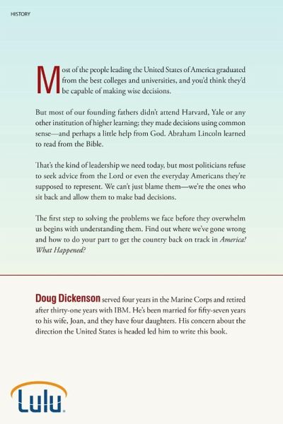 Most of the people leading the United States of America graduated from the best colleges and universities, and you'd think they'd be capable of making wise decisions. But most of our founding fathers didn't attend Harvard, Yale or any other institution of higher learning; they made decisions using common sense-and perhaps a little help from God. Abraham Lincoln learned to read from the Bible. That's the kind of leadership we need today, but most politicians refuse to seek advice from the Lord or even the everyday Americans they're supposed to represent. We can't just blame them-we're the ones who sit back and allow them to make bad decisions. The first step to solving the problems we face before they overwhelm us begins with understanding them. Find out where we've gone wrong and how to do your part to get the country back on track in America! What Happened?