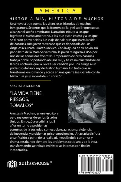 AMÉRICA. HISTORIA MÍA, HISTORIA DE MUCHOS. Novela que cuenta las silenciosas historias de muchos en inmigrantes. Secretos que la frontera calla, y el súdor que cuesta alcanzar el sueño americano. Narración-tributo a los que lograron el sueño americano, a los que están en eso y a los que se dieron por vencidos. Un viaje de palabras que narra la vida de Zacarías, una joven mexicana deportada de Los Ángeles a su natal Juárez, México. Con la ayuda de su novio, un pandillero de la Mara Salvatrucha, la joven reingresa a USA, por una de las conocidas fronteras. Empezando de cero Zacarías trabaja doble, soportando abusos mil, y hasta involucrándose en la vida nocturna que la lleva a ser vendida por una amiga a un poderoso italiano, rey del tráfico humano. Un trato que se transforma en romance y acaba en una guerra inesperada con la Mafia rusa y sacerdote sin corazón...