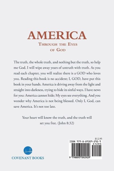 The truth, the whole truth, and nothing but the truth, so help me God. I will wipe away years of untruth with truth. As you read each chapter, you will realize there is a God who loves you. Reading this book is no accident; I, God, have put this book in your hands. America is driving away from the light and straight into darkness, trying to hide its sinful ways. I have news for you: America cannot hide; My eyes see everything. And you wonder why America is not being blessed. Only I, God, can save America. It's not too late. Your heart will know the truth, and the truth will set you free. (John 8:32)