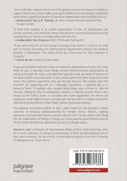 If you ever wondered who becomes an American ambassador and why, this is the book for you. It describes how Foreign Service officers become ambassadors by rising up through the ranks, and why they typically make up about 70 percent of the total number of ambassadors. It also covers where the other 30 percent come from-the political appointees who get the job because they helped elect the president by supporting him as a campaign contributor, a political ally, or a personal friend. It explains why, despite being illegal and a threat to national security, selling the title of ambassador remains a common practice that is also unique to the United States. It considers why some suggestions for reform are misguided, what might be done, and why who the president is matters so much in determining how well the United States will be represented abroad.
