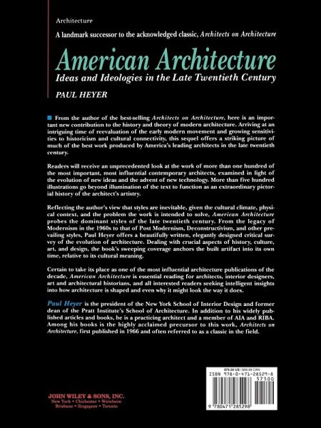 A landmark successor to the acknowledged classic, Architects on Architecture American Architecture Ideas and Ideologies in the Late Twentieth Century Paul Heyer From the author of the best-selling Architects on Architecture, here is an important new contribution to the history and theory of modern architecture. Arriving at an intriguing time of reevaluation of the early modern movement and growing sensitivities to historicism and cultural connectivity, this sequel offers a striking picture of much of the best work produced by America's leading architects in the late twentieth century. Readers will receive an unprecedented look at the work of more than one hundred of the most important, most influential contemporary architects, examined in light of the evolution of new ideas and the advent of new technology. More than five hundred illustrations go beyond illumination of the text to function as an extraordinary pictorial history of the architect's artistry. Reflecting the author's view that styles are inevitable, given the cultural climate, physical context, and the problem the work is intended to solve, American Architecture probes the dominant styles of the late twentieth century. From the legacy of Modernism in the 1960s to that of Post Modernism, Deconstructivism, and other prevailing styles, Paul Heyer offers a beautifully written, elegantly designed critical survey of the evolution of architecture. Dealing with crucial aspects of history, culture, art, and design, the book's sweeping coverage anchors the built artifact into its own time, relative to its cultural meaning. Certain to take its place as one of the most influential architecture publications of the decade, American Architecture is essential reading for architects, interior designers, art and architectural historians, and all interested readers seeking intelligent insights into how architecture is shaped and even why it might look the way it does.