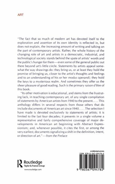 From the Preface:The fact that so much of modern art has devoted itself to the exploration and assertion of its own identity is reflected in, but does not explain, the increasing amount of writing and talking on the part of contemporary artists. Rather, the whole history of the changing role of art and artists in a democratic, industrial, and technological society stands behind the spate of artists' words and the public's hunger for them?even some of the general public out there beyond art's little circle. Statements by artists appeal somewhat the way drawings do: they bring us, or at least they hold the promise of bringing us, closer to the artist's thoughts and feelings and to an understanding of his or her modus operandi; they hold the keys to a mysterious realm. And sometimes they offer us the sheer pleasure of good reading. Such is the primary raison d'¿e of this book.Its other motivation is educational, and stems from the frustrating lack, in teaching contemporary art, of any single compilation of statements by American artists from 1940 to the present.? This anthology differs in several respects from those others that do include documents of American art since 1940.? The selection I have made is devoted exclusively to statements of artists; it is limited to the last four decades; it presents in a single volume a representative and fairly comprehensive coverage of major developments in American art beginning with Abstract Expressionism; and, whenever possible, it cities the first, or among the very earliest, documents signalizing a shift in the definition, intent, or direction of art.?