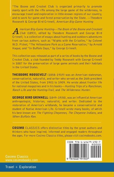 "The Boone and Crocket Club is organized primarily to promote manly sport with the rifle among the large game of the wilderness, to encourage travel and exploration in little-known regions of our country, and to work for game and forest preservation by the State." -Theodore Roosevelt & George Bird Grinnell, American Big-Game Hunting American Big-Game Hunting-The Book of the Boone and Crockett Club (1893), edited by Theodore Roosevelt and George Bird Grinnell, is a collection of essays about hunting and outdoors adventures from various authors, such as "Nights with the Grizzlies," by Colonel…mehr
