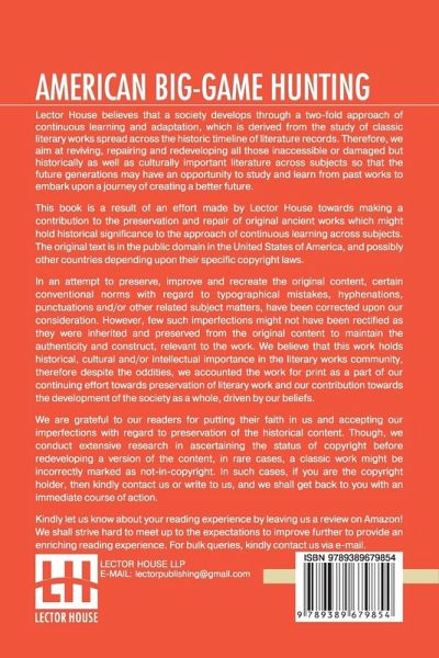 American Big-Game Hunting: The Book Of The Boone And Crockett Club Edited By Theodore Roosevelt, George Bird Grinnell This book is a result of an effort made by us towards making a contribution to the preservation and repair of original classic literature. In an attempt to preserve, improve and recreate the original content, we have worked towards: 1. Type-setting & Reformatting: The complete work has been re-designed via professional layout, formatting and type-setting tools to re-create the same edition with rich typography, graphics, high quality images, and table elements, giving our readers the feel of holding a 'fresh and newly' reprinted and/or revised edition, as opposed to other scanned & printed (Optical Character Recognition - OCR) reproductions. 2. Correction of imperfections: As the work was re-created from the scratch, therefore, it was vetted to rectify certain conventional norms with regard to typographical mistakes, hyphenations, punctuations, blurred images, missing content/pages, and/or other related subject matters, upon our consideration. Every attempt was made to rectify the imperfections related to omitted constructs in the original edition via other references. However, a few of such imperfections which could not be rectified due to intentional\unintentional omission of content in the original edition, were inherited and preserved from the original work to maintain the authenticity and construct, relevant to the work. We believe that this work holds historical, cultural and/or intellectual importance in the literary works community, therefore despite the oddities, we accounted the work for print as a part of our continuing effort towards preservation of literary work and our contribution towards the development of the society as a whole, driven by our beliefs. We are grateful to our readers for putting their faith in us and accepting our imperfections with regard to preservation of the historical content. HAPPY READING!