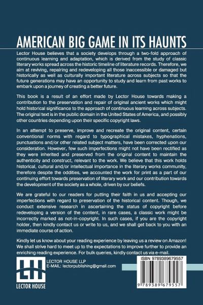 American Big Game In Its Haunts: The Book Of The Boone And Crockett Club Edited By George Bird Grinnell This book is a result of an effort made by us towards making a contribution to the preservation and repair of original classic literature. In an attempt to preserve, improve and recreate the original content, we have worked towards: 1. Type-setting & Reformatting: The complete work has been re-designed via professional layout, formatting and type-setting tools to re-create the same edition with rich typography, graphics, high quality images, and table elements, giving our readers the feel of holding a 'fresh and newly' reprinted and/or revised edition, as opposed to other scanned & printed (Optical Character Recognition - OCR) reproductions. 2. Correction of imperfections: As the work was re-created from the scratch, therefore, it was vetted to rectify certain conventional norms with regard to typographical mistakes, hyphenations, punctuations, blurred images, missing content/pages, and/or other related subject matters, upon our consideration. Every attempt was made to rectify the imperfections related to omitted constructs in the original edition via other references. However, a few of such imperfections which could not be rectified due to intentional\unintentional omission of content in the original edition, were inherited and preserved from the original work to maintain the authenticity and construct, relevant to the work. We believe that this work holds historical, cultural and/or intellectual importance in the literary works community, therefore despite the oddities, we accounted the work for print as a part of our continuing effort towards preservation of literary work and our contribution towards the development of the society as a whole, driven by our beliefs. We are grateful to our readers for putting their faith in us and accepting our imperfections with regard to preservation of the historical content. HAPPY READING!
