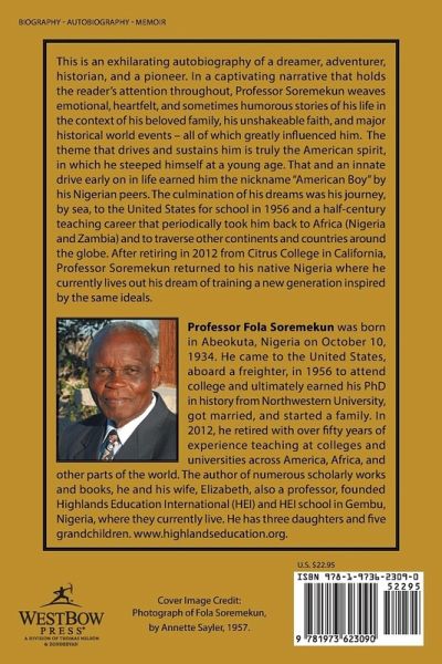 This is an exhilarating autobiography of a dreamer, adventurer, historian, and a pioneer. In a captivating narrative that holds the readers attention throughout, Professor Soremekun weaves emotional, heartfelt, and sometimes humorous stories of his life in the context of his beloved family, his unshakeable faith, and major historical world events all of which greatly influenced him. The theme that drives and sustains him is truly the American spirit, in which he steeped himself at a young age. That and an innate drive early on in life earned him the nickname American Boy by his Nigerian peers. The culmination of his dreams was his journey, by sea, to the United States for school in 1956 and a half-century teaching career that periodically took him back to Africa (Nigeria and Zambia) and to traverse other continents and countries around the globe. After retiring in 2012 from Citrus College in California, Professor Soremekun returned to his native Nigeria where he currently lives out his dream of training a new generation inspired by the same ideals.