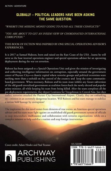 GLOBALLY - POLITICAL LEADERS HAVE BEEN ASKING THE SAME QUESTION: "WHERE'S THE MISSING MONEY GOING TO FUND ALL THESE CONFLICTS?" "YOU ARE ABOUT TO GET AN INSIDE VIEW OF COORDINATED INTERNATIONAL CORRUPTION." THIS BOOK OF FICTION WAS INSPIRED BY ONE SPECIAL OPERATIONS ADVISOR'S EXPERIENCES. It is 2017 as Samuel Ralston, born and raised on the East Coast of the USA , learns he will serve as the base internal operations engineer and special operations advisor for an upcoming deployment during the war on terrorism. Ralston has been assigned to a Special Operations Unit and given the mission of investigating and collecting intelligence information on corruption, especially around the government center of Poytaxt City-a chaotic capital where terrorist groups and political extremists want nothing more than a toehold on the control of the country and keep the same communistbased government. When necessary, Ralston and his team must inhibit any future subversion of the old guard centralized government as coalition forces back the newly elected and popular prime minister, all while keeping his team from being killed. After the team completes all the pre-deployment requirements, they depart Louisiana for Troygekistan in Central Asia. Just days earlier, terrorists attacked the Poytaxt City International Airport. Clearly, they are embarking on a mission in an extremely dangerous location. Will Ralston and his team manage to stabilize a nation held hostage by corruption? The inspiration for this novel comes from elements of true events, an American special operations advisor and his team must fight against an established old guard government system of officials to stop misconduct, malfeasance and collaboration with terrorist organizations while on a complex mission to help stabilize a nation and stop foreign intervention.