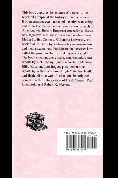 This book captures the essence of a never-to-be-repeated glimpse at the history of media research. It offers a unique examination of the origins, meaning, and impact of media and communication research in America, with links to European antecedents. Based on a high-level seminar series at Columbia University's Freedom Forum Media Studies Center, the book features work by leading scholars, researchers, and media executives. Participants in the series have called the program "heroic and unprecedented." The book encompasses essays, commentaries, and reports by such leading figures as William McGuire, Elihu Katz, and Leo Bogart, plus posthumous reports by Wilbur Schramm, Malcolm Beville, and Hilde Himmelweit. It also contains original insights on the collaboration of Frank Stanton, Paul Lazarfeld, and Robert K. Merton.