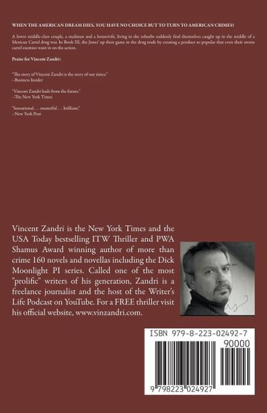 WHEN THE AMERICAN DREAM DIES, YOU HAVE NO CHOICE BUT TO TURN TO AMERICAN CRIMES! A lower middle-class couple, a mailman and a housewife, living in the suburbs suddenly find themselves caught up in the middle of a Mexican Cartel drug war. In Book III, the Jones' up their game in the drug trade by creating a product so popular that even their sworn cartel enemies want in on the action. Grab your pulse-pounding copy now! Praise for Vincent Zandri: "The story of Vincent Zandri is the story of our times." --Business Insider "Vincent Zandri hails from the future." --The New York Times "Sensational . . . masterful . . . brilliant." --New York Post
