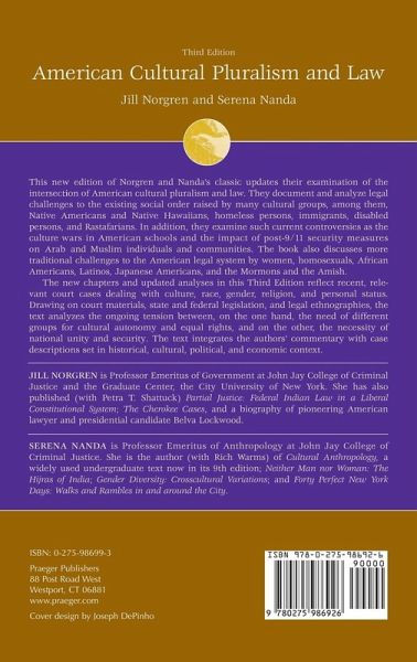 This new edition of Norgren and Nanda's classic updates their examination of the intersection of American cultural pluralism and law. They document and analyze legal challenges to the existing social order raised by many cultural groups, among them, Native Americans and Native Hawaiians, homeless persons, immigrants, disabled persons, and Rastafarians. In addition, they examine such current controversies as the culture wars in American schools and the impact of post-9/11 security measures on Arab and Muslim individuals and communities. The book also discusses more traditional challenges to the American legal system by women, homosexuals, African Americans, Latinos, Japanese Americans, and the Mormons and the Amish. The new chapters and updated analyses in this Third Edition reflect recent, relevant court cases dealing with culture, race, gender, religion, and personal status. Drawing on court materials, state and federal legislation, and legal ethnographies, the text analyzes the ongoing tension between, on the one hand, the need of different groups for cultural autonomy and equal rights, and on the other, the necessity of national unity and security. The text integrates the authors' commentary with case descriptions set in historical, cultural, political, and economic context. While the authors' thesis is that law is an instrument of social policy that has generally furthered an assimilationist agenda in American society, they also point out how in different periods, under different circumstances, and with regard to different groups, law has also some opportunity for cultural autonomy.