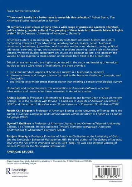 This second edition of American Culture includes contemporary events and provides an introduction to American civilization. Extracts are taken from diverse sources such as political addresses, articles, interviews, oral histories and advertisements. Edited by academics who are highly experienced in the study and teaching of American Studies across a wide range of institutions, this book provides: texts that introduce aspects of American society in a historical perspective primary sources and images that can be used as the basis for illustration, analysis and discussion linking text which stresses themes rather than offering a simple chronological survey. American Culture brings together primary texts from 1600 to the present day to present a comprehensive overview of, and introduction to, American culture.