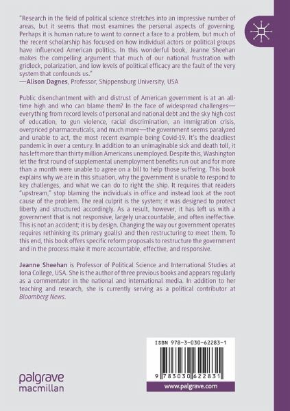 Public disenchantment with and distrust of American government is at an all-time high and who can blame them? In the face of widespread challenges-everything from record levels of personal and national debt and the sky high cost of education, to gun violence, racial discrimination, an immigration crisis, overpriced pharmaceuticals, and much more-the government seems paralyzed and unable to act, the most recent example being Covid-19. It's the deadliest pandemic in over a century. In addition to an unimaginable sick and death toll, it has left more than thirty million Americans unemployed. Despite this, Washington let the first round of supplemental unemployment benefits run out and for more than a month were unable to agree on a bill to help those suffering. This book explains why we are in this situation, why the government is unable to respond to key challenges, and what we can do to right the ship. It requires that readers "upstream," stop blaming the individuals in officeand instead look at the root cause of the problem. The real culprit is the system; it was designed to protect liberty and structured accordingly. As a result, however, it has left us with a government that is not responsive, largely unaccountable, and often ineffective. This is not an accident; it is by design. Changing the way our government operates requires rethinking its primary goal(s) and then restructuring to meet them. To this end, this book offers specific reform proposals to restructure the government and in the process make it more accountable, effective, and responsive.