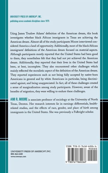 Acknowledgements Introduction Chapter 1: Pre and Post Immigration Views of Black African-born Immigrants in Texas Chapter 2: The American Dream as Defined by Black African Immigrants Chapter 3: Black African Immigrants and the American Dream as Defined by James Truslow Adams Chapter 4: Migrating out of the United States Chapter 5: Future of American-born Children of Black African-born Immigrants Chapter 6: Future of Black African Immigrants and the American Dream Appendix Bibliography