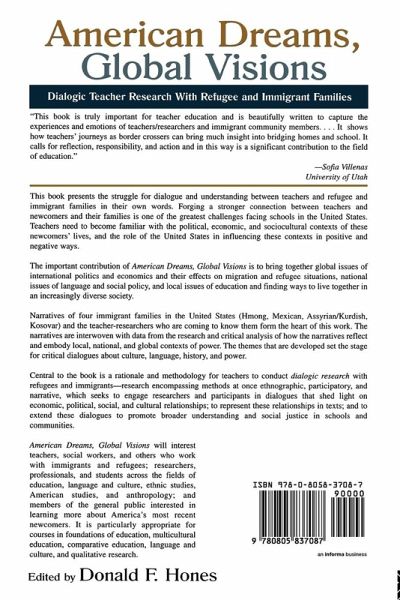 This book presents the struggle for dialogue and understanding between teachers and refugee and immigrant families, in their own words. Forging a stronger connection between teachers, newcomers, and their families is one of the greatest challenges facing schools in the United States. Teachers need to become familiar with the political, economic, and sociocultural contexts of these newcomers' lives, and the role of the U.S. in influencing these contexts in positive and negative ways. The important contribution of American Dreams, Global Visions is to bring together global issues of international politics and economics and their effects on migration and refugee situations, national issues of language and social policy, and local issues of education and finding ways to live together in an increasingly diverse society. Narratives of four immigrant families in the United States (Hmong, Mexican, Assyrian/Kurdish, Kosovar) and the teacher-researchers who are coming to know them form the heart of this work. The narratives are interwoven with data from the research and critical analysis of how the narratives reflect and embody local, national, and global contexts of power. The themes that are developed set the stage for critical dialogues about culture, language, history, and power. Central to the book is a rationale and methodology for teachers to conduct dialogic research with refugees and immigrants--research encompassing methods as once ethnographic, participatory, and narrative--which seeks to engage researchers and participants in dialogues that shed light on economic, political, social, and cultural relationships; to represent these relationships in texts; and to extend these dialogues to promote broader understanding and social justice in schools and communities. American Dreams, Global Visions will interest teachers, social workers, and others who work with immigrants and refugees; researchers, professionals, and students across the fields of education, language and culture, ethnic studies, American studies, and anthropology; and members of the general public interested in learning more about America's most recent newcomers. It is particularly appropriate for courses in foundations of education, multicultural education, comparative education, language and culture, and qualitative research.