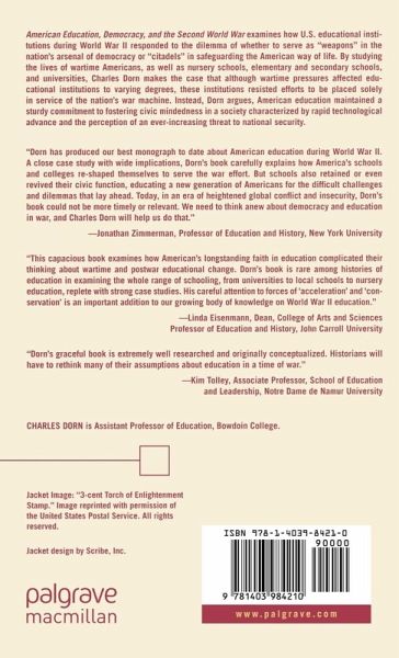 "Dorn has produced our best monograph to date about American education during World War II. A close case study with wide implications, Dorn's book carefully explains how America's schools and colleges re-shaped themselves to serve the war effort. But schools also retained or even revived their civic function, educating a new generation of Americans for the difficult challenges and dilemmas that lay ahead. Today, inan era of heightenedglobal conflict and insecurity, Dorn's book could not be more timely or relevant. Weneed to think anew about democracy and education in war, and Charles Dorn will help us do that." - Jonathan Zimmerman, Professor of Education and History, New York University