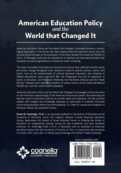 American Education Policy and the World that Changed It provides students a chronological exploration of the forces that have shaped American education policy from the colonial period through to the enactment of the Every Student Succeeds Act (ESSA) in 2015. It thoroughly examines the intersection of national and international events that impacted successive generations of American public schooling. The book illuminates how American educational policies have reflected societal values and driven change throughout time. Attention is paid to specific periods, events, and topics, such as the establishment of colonial American education, the influence of federal educational policy post-Civil War, the Progressive Era and its expansion of equity in education, and historical milestones like the Brown Decision and the "Great Society." Readers learn about the inception of school choice, the No Child Left Behind (NCLB) era, and the current ESSA framework. American Education Policy and the World that Changed It encourages critical discourse on the historical underpinnings of the American educational system. By examining the reactive nature of education policies to societal needs and pressures, the text provides readers with insights and knowledge necessary to participate in essential discourse surrounding education reform and policymaking. It is ideal for courses and programs in American history and education history.