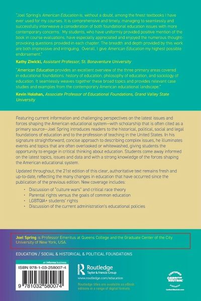 "Joel Spring's American Education is, without a doubt, among the finest textbooks I have ever used for my courses. It is comprehensive and timely, managing to seamlessly and successfully interweave a consideration of both foundational education issues with more contemporary concerns. My students, who have uniformly provided positive mention of the book in course evaluations, have especially appreciated and enjoyed the numerous thought-provoking questions provided in each chapter. The breadth and depth provided by this work are both impressive and intriguing. Overall, I give American Education my highest possible endorsement."
