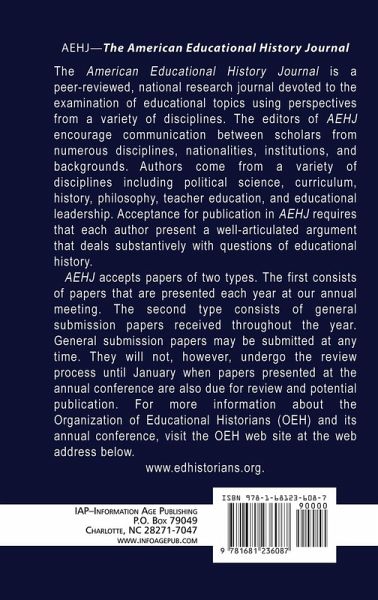 Volume 43 Numbers 1 & 2 2016 The American Educational History Journal is a peer¿reviewed, national research journal devoted to the examination of educational topics using perspectives from a variety of disciplines. The editors of AEHJ encourage communication between scholars from numerous disciplines, nationalities, institutions, and backgrounds. Authors come from a variety of disciplines including political science, curriculum, history, philosophy, teacher education, and educational leadership. Acceptance for publication in AEHJ requires that each author present a well¿articulated argument that deals substantively with questions of educational history. AEHJ accepts papers of two types. The first consists of papers that are presented each year at our annual meeting. The second type consists of general submission papers received throughout the year. General submission papers may be submitted at any time. They will not, however, undergo the review process until January when papers presented at the annual conference are also due for review and potential publication. For more information about the Organization of Educational Historians (OEH) and its annual conference, visit the OEH web site at: www.edhistorians.org.