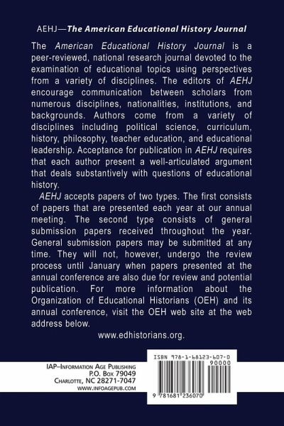 Volume 43 Numbers 1 & 2 2016 The American Educational History Journal is a peer¿reviewed, national research journal devoted to the examination of educational topics using perspectives from a variety of disciplines. The editors of AEHJ encourage communication between scholars from numerous disciplines, nationalities, institutions, and backgrounds. Authors come from a variety of disciplines including political science, curriculum, history, philosophy, teacher education, and educational leadership. Acceptance for publication in AEHJ requires that each author present a well¿articulated argument that deals substantively with questions of educational history. AEHJ accepts papers of two types. The first consists of papers that are presented each year at our annual meeting. The second type consists of general submission papers received throughout the year. General submission papers may be submitted at any time. They will not, however, undergo the review process until January when papers presented at the annual conference are also due for review and potential publication. For more information about the Organization of Educational Historians (OEH) and its annual conference, visit the OEH web site at: www.edhistorians.org.