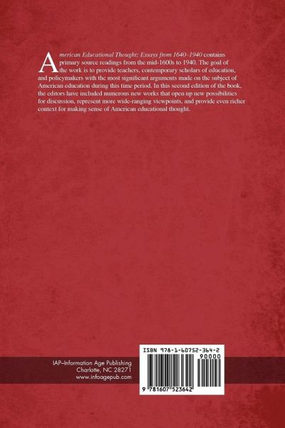 A volume in Readings in Educational Thought Series Editors Andrew J. Milson, Chara Haeussler Bohan, Perry L. Glanzer and J. Wesley Null American Educational Thought: Essays from 1640-1940 contains primary source readings from the mid 1600s to 1940. The goal of the work is to provide teachers, contemporary scholars of education, and policymakers with the most significant arguments made on the subject of American education during this time period. In this second edition of the book, the editors have included numerous new works that open up new possibilities for discussion, represent more wide-ranging viewpoints, and provide even richer context for making sense of American educational thought.